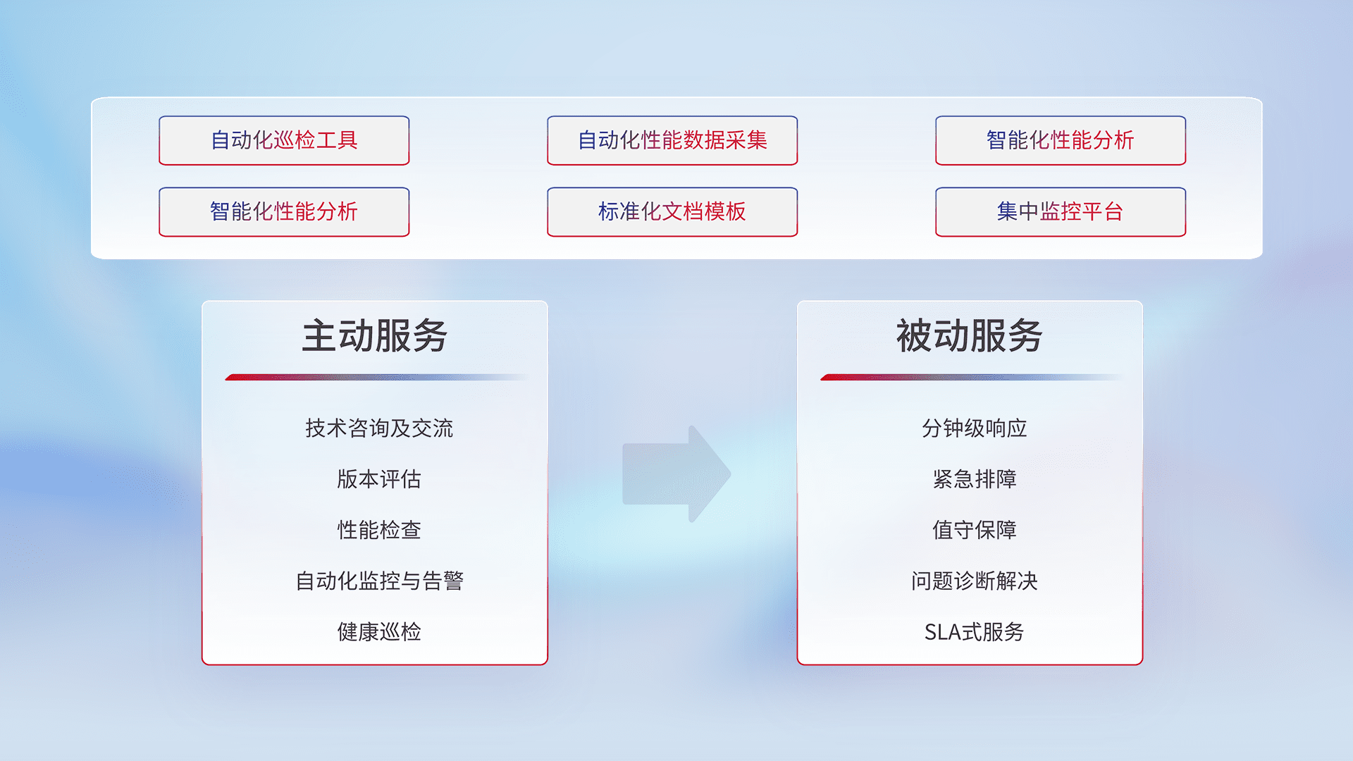 智能化工具和标准化文档,,保障服务质量,,提供主动服务(包含技术咨询、、版本评估、、、、性能检查、、、、自动化监控与告警、、健康巡检)和被动服务包含(分钟级响应、、、、紧急排障、、、值守保障、、问题诊断解决、、、、SLA服务)。。